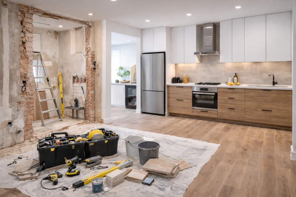 Qué hacemos: renovación completa de viviendas, locales y espacios comerciales, coordinando todos los gremios desde el inicio hasta la entrega final.
